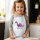 This girls' apron features a cute illustration of a purple and green dinosaur with pink spots and long eyelashes. Personalize it with your child's name in black letters.