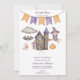 This sweet Halloween baby shower design features hand-painted purple witches, pumpkins, and a cozy haunted house. Perfect for a fall celebration with a whimsical, gentle aesthetic. A lovely choice for parents who love soft Halloween colours and playful cottagecore charm.