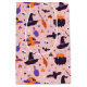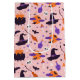 This design showcases a whimsical and vibrant Halloween pattern with a playful colour scheme. The design features a soft pink background, adorned with an array of classic Halloween icons. Among them are witch hats, cauldrons bubbling with potions, flying bats, skulls, broomsticks, and bottles of potion. There are also elements like mushrooms, stars, crescent moons, and clouds, all rendered in a palette of rich purples, oranges, and blacks. The overall effect is a fun and festive pattern that captures the spooky yet lighthearted spirit of Halloween, perfect for decorations, costumes, or party supplies.