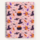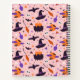 This design showcases a whimsical and vibrant Halloween pattern with a playful colour scheme. The design features a soft pink background, adorned with an array of classic Halloween icons. Among them are witch hats, cauldrons bubbling with potions, flying bats, skulls, broomsticks, and bottles of potion. There are also elements like mushrooms, stars, crescent moons, and clouds, all rendered in a palette of rich purples, oranges, and blacks. The overall effect is a fun and festive pattern that captures the spooky yet lighthearted spirit of Halloween, perfect for decorations, costumes, or party supplies.