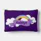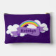 Beautiful purple cosmetic bag or pencil pouch which features a cute cheerful rainbow with fun white clouds on a pretty violet background. Customize with a name for a great kids gift.