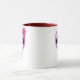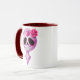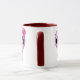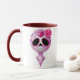 This loveable purple sugar skull is decorated with tribal swirls and drops with a large violet heart in the middle of the forehead. A single red rose sits on the side of the round skull just above the large black eyes. Flower pedals surround the eyes and the mouth has stitches that make their way up the side of the cheek. This mug design is an adorable example of this Day of the Dead symbol.