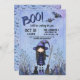 The design features a sweet little witch in purple stripes with her black cat and friendly bats flying above. A whimsical blue and purple background with stars sets the scene for a fun and festive afternoon. Perfect for children’s costume parties.