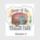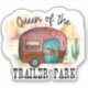 Laptop contour sticker with a painting of a cute camper trailer parked in the desert with rocks and cacti all around. Text says, "Queen of the trailer park."