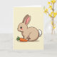This card features a stylized rabbit 🐰 sitting in profile at the center, set against a muted yellow background with a faint grid texture. Its fur is a warm biscuit tone with gentle shading, giving the rounded body a soft, cozy look. Large black eyes catch a tiny highlight, and the slight tilt of its head reads like a shy, friendly glance toward someone nearby. A rosy blush warms its cheeks, echoing the pale pink inside its long upright ears, which feel attentive and affectionate. In front of the rabbit rests a bright orange carrot with leafy green tops, adding a cheerful contrast and a small shared-treat moment 🐇. A short Easter greeting appears near the top in a simple light-colored font, balanced by open space around the illustration. The white curl of the rabbit’s tail sits near the back edge, and fine lines define the carrot ridges and the soft shadow beneath both.