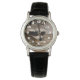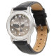 A watch with a photograph of a cute and curious raccoon resting his face on a wooden log. Adorable.