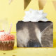 Wrapping paper with a photograph of a cute and curious raccoon resting his face on a wooden log. Adorable.