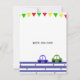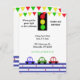 A fun design for a young ones birthday. Racing cars in red, blue and green. Border of red and white stripes with little red stars. Traffic lights and a fun birthday banner.