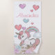 This enchanting custom beach towel features a magical unicorn theme. A cute unicorn with pink hair and a gold glitter horn is placed in the centre, above a bouquet of pastel coloured roses. A pretty rainbow and matching hearts is printed behind the unicorn. A sample name is printed at the top in a whimsical pink font which you can personalize to include your own name or custom text.
