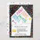 Adorable moving announcement invitation cards with a quirky, fun little house with the new address details inside and the hand-lettered "New Home Sweet Home" on top with a key and a balloon. On the back is a cute black and white pattern illustration of a bike, car, key, air balloon and "We've moved!" text. All in fun rainbow colours perfect for families with kids!