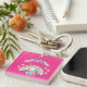 This cute and colourful custom keychain features a beautiful illustration of a unicorn and pastel coloured rainbow, over a hot pink background. Little stars in matching colours surround the rainbow. Faux pink glitter accents the top and bottom portions. A banner is printed above the unicorn with a sample name in an elegant purple script font. You can personalize the keychain to include your own custom name or text.