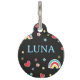 This adorable personalized pet ID tag features a sleek black background decorated with playful rainbow elements, including tiny stars, paws, and hearts in bright, cheerful colors. The colorful details pop beautifully against the dark base, giving the tag a fun yet modern look.