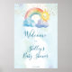 A beautiful blue watercolour baby shower welcome sign with a cute rainbow, clouds and smiley face sun for your baby shower shower, party etc Matching items available in our shop.