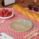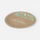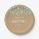 Chic mint green raindrops fall towards your personalised details on a rustic kraft boho background, on this cute gender neutral baby sprinkle, shower or couples shower paper plate. Designed by Thisisnotme©
