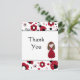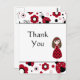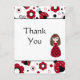 This thank you post card has a ladybug theme. The top and bottom border has black and red lady bugs with flowers and polkadots. There is a girl with brown hair wearing a polkadot dress next to thank you on the front. On the backside, you can easily customize the thank you message.