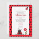 Cute Red Black Ladybug Baby Shower Invitation. Features a flying ladybug with heart tracks and a flower with ladybugs climbing up the stem. Mom to be will be thrilled with this one of a kind baby shower invitation.
