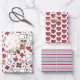 A trio of matching wrapping paper sheets with a medical theme. One features a cute pattern of thermometers, stethoscopes, bandaids, hearts with an ecg curve, and medicine on a white background. One features a pattern of hearts with ecg curves. And one has matching stripes in red, white, and pale blue.
