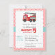 Get children guests fired up for the party with this red fire truck birthday party invitation! The invitation comes with a red fire truck that has white stripes on its side and a retractable ladder with hose. A red slanted stripes pattern for background. A colour palette of red, white, blue and grey. Personalise easily with your party details.