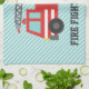 A kitchen towel with a cute red fire truck that has white stripes on its side and a retractable ladder with hose. Slanted blue stripes for background. Colour palette of red, blue, grey and white. Personalise with child's name and call they a fire fighter. Great for kids, especially boys, who love vehicle toys and fire engines!