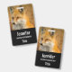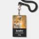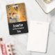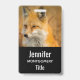 A name tag with a beautiful photograph of a red fox in autumn. Standing in the wilderness among the brush.