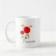 A personalized mug with a charming drawing of several whimsical red flowers with fat hearts attached to a green stem. 2 yellow butterflies hovering nearby. Sketched with a black outline. Whimsical and cute design.