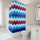A shower curtain featuring a colourful, cute pattern design of red, white, and blue chevrons.