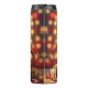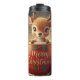 A highly cheerful and magical Christmas image featuring an adorable, big-eyed baby reindeer (fawn) popping out of a large, sparkling red mug. The mug is decorated with the gold script text 'Merry Christmas' and holly designs. The entire scene is set on a glittering gold surface, surrounded by festive items like candy canes, red berries, and small wrapped gifts. The background is a stunning display of warm, blurred red and golden bokeh lights, creating a sparkling, cozy, and highly festive holiday atmosphere with a focus on cuteness