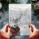 Cute reindeer red tartan scarf Christmas Holiday greeting Card. This Christmas greeting card features a charming winter reindeer wearing a cozy scarf and adorned with festive Christmas lights. The reindeer stands gracefully in a snowy landscape, with a soft, wintry background of subtle snowflakes drifting down around it. Its soft fur is lightly textured, and its large, gentle eyes and warm expression radiate holiday cheer and warmth. A vibrant scarf, in traditional holiday colours, wraps snugly around the reindeer’s neck. This heartwarming design captures the spirit of the season, making it perfect for spreading holiday joy and delight to loved ones.