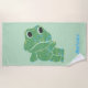 Create an un-froggettable gift when you add a name to this beach towel. It features a cute retro style frog illustration. The green cartoon frog has blue and yellow speckles. Your name or other text appears in bright blue lettering.