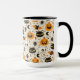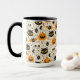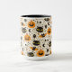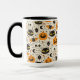 This design presents a cute and whimsical Halloween pattern filled with a delightful assortment of classic spooky icons. The background is a light cream colour, providing a soft contrast to the bold designs. The pattern includes playful jack-o'-lanterns with different expressions, black cats with bright yellow eyes, smiling skulls, and friendly bats with orange wings. Scattered throughout are spiders, crescent moons, stars, mushrooms, and magical symbols, all adding to the enchanting Halloween atmosphere. The colour palette features striking blacks, oranges, and yellows, creating a lively and festive design perfect for Halloween decorations, clothing, or party themes. The overall feel is fun and charming, ideal for celebrating the spooky season with a touch of sweetness.