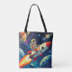 Cute birthday tote bag with a retro comic book style illustration of a little boy flying on a rocket through space!