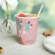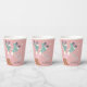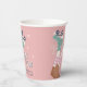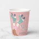 Cute pastel pink roller skating birthday paper cups featuring a retro-inspired illustration of teal roller skates on a dark skin girl wearing pink-striped tube socks and "Let's Roll" in a 70's style script. Add her name dark teal blue typography.
