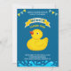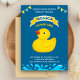 Invite your guests with this cute birthday party invitation featuring an adorable rubber duck with vibrant elements against a blue background. Simply add your event details on this easy-to-use template to make it a one-of-a-kind invitation. Flip the card over to reveal a yellow and white stripes pattern on the back of the card.