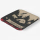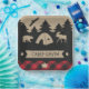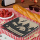 Cute kraft brown, black and red buffalo plaid flannel camping birthday party paper plates. Featuring a tent, a moose, and a bear with a textured kraft brown and black background.