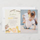 Celebrate your little one's 1st birthday with these fun safari animal themed birthday invitations. Featuring a sloth hanging from a tree branch, a lion, a tiger and a giraffe on the left side with a photo of your baby boy on the right. "WILD ONE" appears in a cute typography in yellow and brown. Reversing to a giraffe pattern on the back.