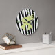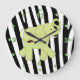 Cute kid's wall clock with cartoon like graphics of a green and white elephant, against a black and white zebra stripe pattern. Numbers and dots representing hours are in green. Great looking clock that will add a decoration to your child's room.