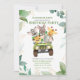 Cute green, white and gold accents with jungle animals riding in a safari vehicle . Design has greenery and leaves and a white background. It is so cute for a Child's Birthday Party Celebration. Perfect for boy or girl.