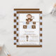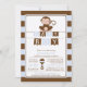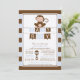 Baby shower de singe safari dans la jungle moderne avec un mignon petit singe dressé sur un arrière - plan rayé bleu & marron avec un accent de rosace et des bannières pendentifs. Retournez l'invitation baby shower de nos garçons pour voir un retour correspondant pour une touche spéciale supplémentaire. Parfait pour un thème singe, le thème jungle ou le thème safari zoo petite douche bébé garçon.