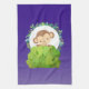 A kitchen towel with a cartoon illustration of a little monkey peeking out from behind a green bush. Surrounded by a wreath of tropical leaves. Set on a purple gradient background.