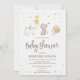 Help celebrate the mom-to-be with this whimsical and elegant baby shower invitation. Features watercolor illustrations of cute woodland animals parading, with musical instruments and adorned with stars. This gender neutral baby shower invite is easy to personalize, simply add names, date, time, venue and other event information. An elegant and fun baby shower invite design.