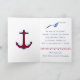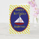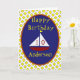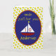 This bright cheerful birthday card has a red sailboat with a yellow flag. The white sails serve as a template for the child's age. If the child is under 10 years of age, you should leave the first sail without a number. Happy Birthday is above the cute boat and the child's name is below. The boat and the text are framed within a handsome light navy blue. The artwork is backdropped with a bright yellow check against white. Inside the card, there is a kedge anchor, seagull, and nautical flags. The inside greeting reads: We wish you the happiest, brightest future that you can have.