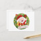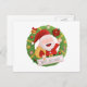 A postcard with a cute Christmas illustration and doodle to put a smile on the recipient's face. It features a jolly Santa Claus who is holding on to a sack of presents popping out from a Christmas wreath! The wreath is decorated with Christmas classics such as star, bells and ribbon, ornaments, Christmas flower, mistletoe and candy cane! Personalize your Christmas greeting in the space provided!