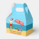 This cute custom Christmas in July party favour box makes perfect summer party decor for a beach bash or pool gathering. Make it a fun north pole themed extravaganza with Santa Claus in his swimming trunks next to a red and white striped beach umbrella and gifts. I've never seen Mr. Klaus in a bathing suit before! The green text ties together the fun Xmas theme.