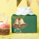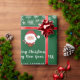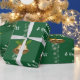 Modern, elegant, and cute Christmas wrapping paper, with a cartoon of Santa Clause in his red hat and costume, the text "Merry Christmas & Happy New Year 20XX" in stylish script / calligraphy handwriting, and a personalized name. With sprinkles of white and silver snowflakes, and two pairs of golden Xmas bells with a sprig of holly, on a Xmas green background.