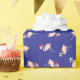 This festive design has a polka dot pattern of pale pink tropical flamingos, all wearing Santa hats, on a traditional, deep blue.