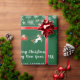 Modern, elegant, and cute Christmas wrapping paper, with an image of a unicorn pulling Santa's sleigh (full of gifts), the text "Merry Christmas & Happy New Year 20XX" in stylish script / calligraphy handwriting, and a personalized name. With sprinkles of white and silver snowflakes, and a pair of Xmas bells with a sprig of holly, on a Xmas green background.