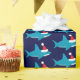 Wrapping Paper with cute, smiling, blue sharks in Santa hats on a blue background.