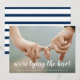 Nautical save the date card with your full bleed horizontal picture and a text overlay with the words, "we're tying the knot" in a white handwriting font. Below are your details in a single line of text. The backside has navy blue and white stripes and a line of text for additional information. A simple and modern design that makes your photo the main feature.