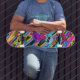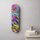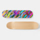 Cute multi-coloured skulls and hearts are set on a colourful background. This bright skull design will be one wild skateboard!