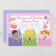 Start your slumber birthday party off right with our cute pajama birthday invitation featuring a group of 3 girls in sleeping bags with popcorn, nail polish, lipstick & hearts & flowers set on a pink stripe background with a purple back. Cute for a sweet tween girls birthday party. Visit our shop to view other stylish modern sleepover birthday party invitations & matching thank you notes, stickers & postage stamps. © Babystar designs